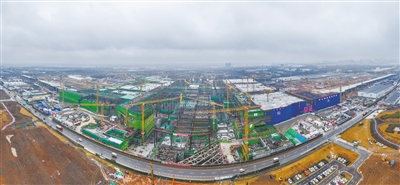 1月30日拍摄的南京北站站房建设现场(无人机全景照片)。