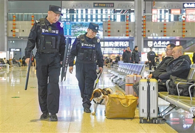 2日,花花跟着朱守君来到大同南站。“花花,走,上班了!”听到指令,花花立刻站到朱守君身旁,一副整装待发的模样。随后,它跟着朱守君来到进站口安检机旁,对着大包小包的物品逐一排查。安检区无异常后,又进入候车大厅巡逻,听着指令这里闻闻、那里嗅嗅,工作相当认真。“我们的任务是在站内排查违禁品,快过年了,大家的行李多,有的旅客可能夹带鞭炮、汽油等违禁品进站上车,这些都是我们的排查重点。别看花花体型不大,却嗅觉灵敏、身手敏捷,体型小的优势让它能在狭窄低矮的空间执行搜索任务,它一旦在物品旁坐下或者卧下,就表明里面藏有危险品。”朱守君说。