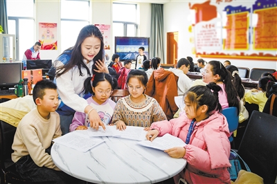 图为大学生志愿者正在指导“双语小讲解员”学习。