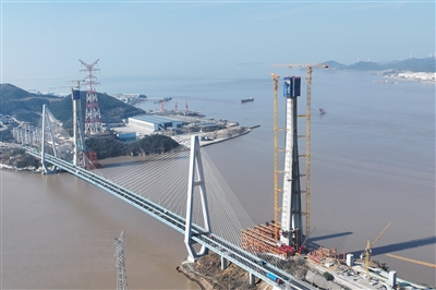 2月4日拍摄的甬舟铁路桃夭门公铁两用大桥6号主塔(右侧),承台以上高度达198.1米(无人机照片)。临近主塔的是桃夭门大桥,也是舟山跨海大桥的重要组成部分。