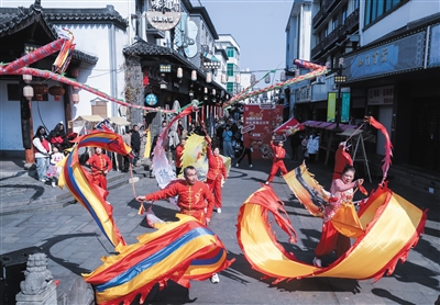 2月8日,演员在寿昌古镇老街上进行民俗踩街表演。