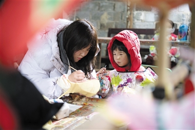 2月7日,在安徽省黄山市黟县碧山村,小朋友和家长体验鱼灯制作。春节临近,位于安徽省黄山市黟县的古村落年味越来越浓,人们按照传统习俗打食桃、写春联。不少游客走进古村落品尝农家宴、体验鱼灯制作、购买当地特色年货,沉浸式感受徽州年味。