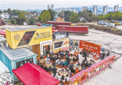 2月9日,在建德市更楼街道司机之家,货车司机和其他外来务工人员一起参加“奔走千里路·幸福一家亲”团圆年夜饭活动(无人机照片)。