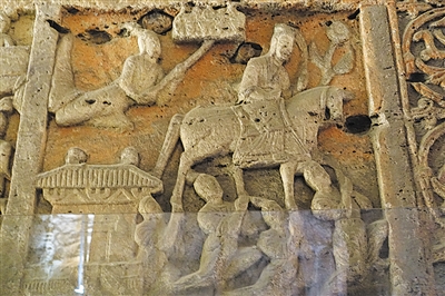 “佛传故事”,是佛经中以佛陀前世事迹为题材的故事集合,展现了悉达多太子从出生到成佛的全过程。云冈石窟保存最好、最经典的“佛传故事”,在今之第6窟。走进第6窟后室,东南壁第二层,有几幅“佛传故事”里悉达多太子骑马的雕刻。这几幅浮雕因在石壁靠下,千百年来经风蚀水浸,多处已然风化,但整体保存较好,连同洞窟里的其他浮雕,组成了完整的“佛传故事”,就是放在整个中国的石窟艺术长廊,也堪称精品。