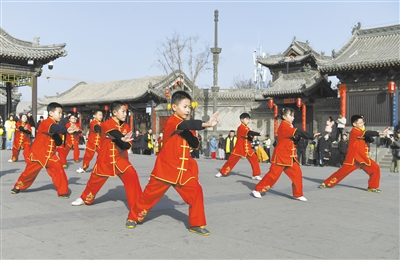 2月25日,市塞外梅花拳协会会员在关帝庙广场举办武术表演活动,为过往市民、游客展示梅花拳套路、器械、对练等传统武术,全面呈现非物质文化遗产独特魅力。 本报记者 于宏摄