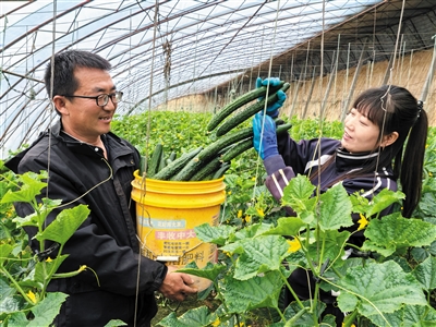初春时节,阳高县设施蔬菜基地一派繁忙的生产景象,农户俯身菜垄间,麻利地采摘水灵鲜嫩的生菜、西葫芦等,一筐筐青翠欲滴的蔬菜整装待发,准备运往市场销售。图为该县东小村镇神泉蜜种植基地农技员闫玉荣(右)夫妇正在采摘鲜嫩的黄瓜。 孙展春摄