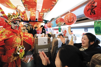 3月1日,演员在G1280次列车上为旅客表演变脸。