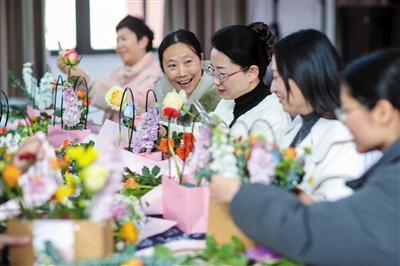 图为3月7日,在江苏省兴化市昭阳街道沧浪社区,女士们在学习插花技艺。