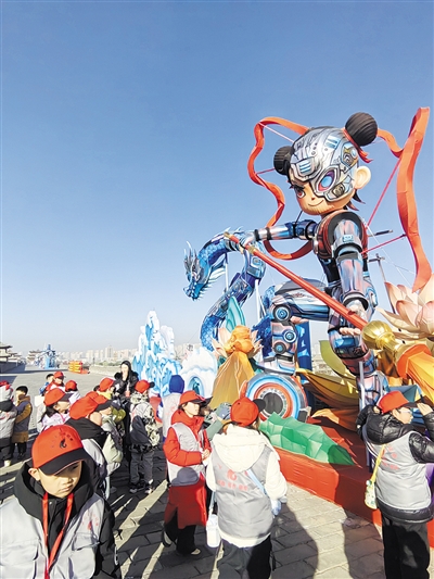迎着冬日暖阳,小记者们登上南城墙。在“南来吉兆”主题区,赛博朋克风格的《哪吒》灯组引发小记者们阵阵惊呼;转角处,《蒜鸟家族》的呆萌造型和《浪浪山小妖怪》的动画复刻场景,成为人气打卡点;《花木兰》灯组前,小记者们争相讲述帼国英雄故事,感受忠孝勇毅的精神力量。随后,带队老师还“剧透”了西城墙《骏福齐天》、北城墙北魏文脉、东城墙《未来演化》等灯组精彩。
