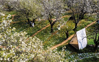 3月10日,游客在昆明名花谷拍照打卡(无人机照片)。