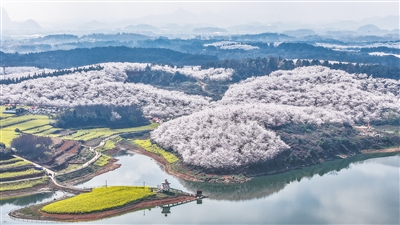 近日,随着气温回升,贵州省贵安新区樱花园内的二点四万亩樱花迎来盛花期。如云似霞的樱花和山川、湖泊、民居构成一幅幅美丽的春日画卷,吸引众多游客前来观光游玩。 新华社记者 陶亮摄