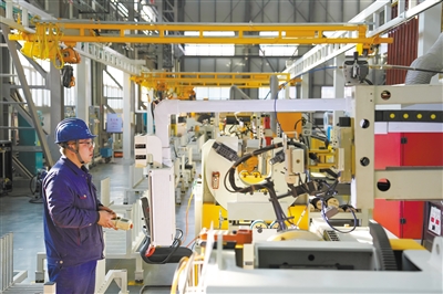 3月11日,技术人员在哈电集团哈尔滨电机厂有限责任公司控制设备事业部数字化车间调试生产设备。