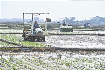 3月12日,工作人员操作插秧机在广西合浦县西场镇田间作业。