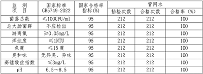 1. 23个采样点常规43项监测结果: 出厂水水质合格率100%;管网水水质合格率100%。