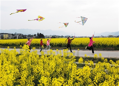 在四川省达州市开江县普安镇新河村“黄金花海”景区,普安镇中心小学学生在油菜花田旁放飞风筝(3月14日摄)。