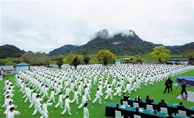 3月21日,在首个“国际太极拳日”太极拳展演活动主会场福建南平武夷山,太极拳爱好者展演太极拳。