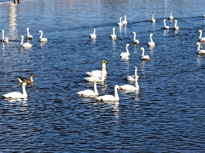 在澄澈的碧波之上,成群的大天鹅悠然浮游,修长的脖颈倒映水中,成为水面最亮眼的风景。豆雁时而列队掠过水面,时而振翅长空,鸣叫声清亮悠远。翘鼻麻鸭等或水鸟结伴穿梭嬉戏,或觅食休憩,与粼粼波光相映成趣。