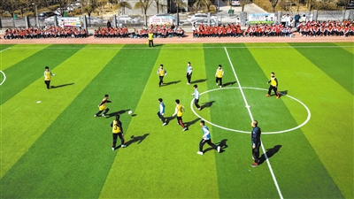 3月24日,平城区18校文兴校区“校长杯”足球联赛正式开赛。绿茵场上,小球员们奋力角逐、配合流畅,精彩攻防不断,尽显阳光向上的校园风貌。本次联赛设男女混合八人制比赛与趣味点球赛。 本报记者 韩堃摄