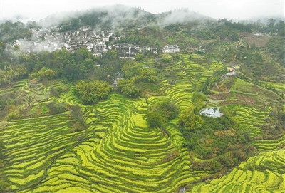 这是3月24日拍摄的江西省婺源县篁岭景区的油菜花梯田(无人机照片)。