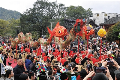 3月28日,在贵州省榕江县三宝侗寨,侗族群众舞稻草龙欢庆“萨玛节”。