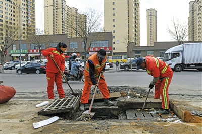 日前,平城区环卫处清洁一公司开展春季平面环境卫生清洗提升行动,对辖区内雨水箅子、污水管网里的落叶淤泥进行清掏,赶在汛期到来前疏通管网,确保降雨来临时排水设施能高效收水、顺畅排水。图为该公司环卫工人在北苑路清理污水管网内淤泥。 本报记者 于宏摄