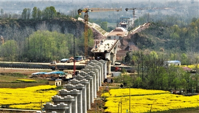 春日,中铁十一局合武高铁安徽段站前三标各施工现场一派繁忙,施工人员利用春季有利天气,高标准高质量推进项目建设。合肥至武汉高速铁路是我国“八纵八横”高铁网沿江通道的重要组成部分,设计时速三百五十公里。线路建成后,将在合肥至武汉间形成新的高铁大通道,进一步优化长江经济带铁路网布局。 新华社记者 周牧摄