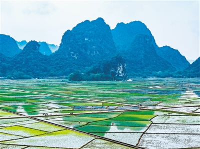 3月29日,农民在广西玉林市兴业县石南镇马塘村田间劳作(无人机照片)。