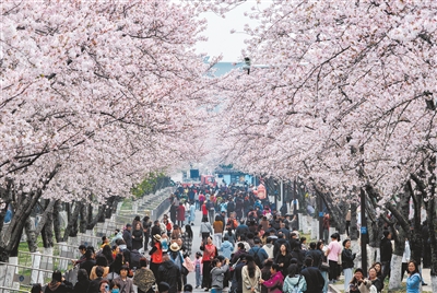 3月31日,游客在江苏省扬州市鉴真路上的“樱花大道”赏樱游玩(无人机照片)。 春风拂面,繁花盛开。人们踏春赏景,漫步在花海之中,感受春日生机与美好。 新华社记者 孟德龙摄