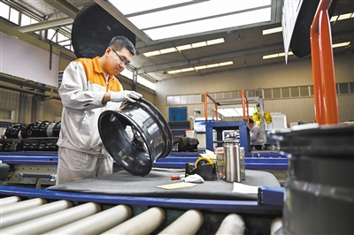 四月一日,工人在包头盛泰汽车零部件制造有限公司铝合金轮毂生产线上作业。