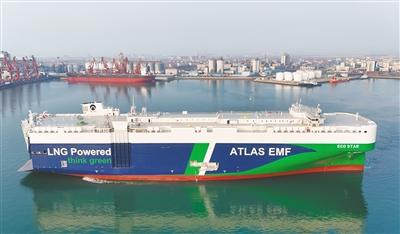 4月2日,7000车位双燃料汽车运输船“洁能之星”轮在山东港口烟台港龙口港区投入运营。该船配备液化天然气(LNG)动力系统,同时采用“氨预留”设计,可在升级改装后使用清洁的氨燃料。该运输船由中集来福士为希腊一航运公司建造,3月30日交付后抵达龙口港区。 新华社发 (唐克摄)