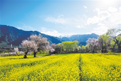 这是林芝市巴宜区朵当村桃花景色(4月2日摄)。入春以来,素有“雪域江南”之称的西藏林芝气温回暖,沿尼洋河与雅鲁藏布江一线连绵上百里的野生桃花竞相盛开,与高耸壮美的雪山相互映衬,吸引游客前来欣赏。 新华社记者 丁增尼达摄