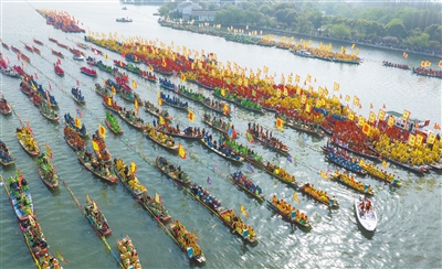 4月6日,2026年泰州姜堰溱潼会船节在江苏省泰州市姜堰区溱湖国家湿地公园开幕,数百条各式船只和上万名会船选手飞篙走桨,奋勇争先,演绎历久弥新的民俗画卷。