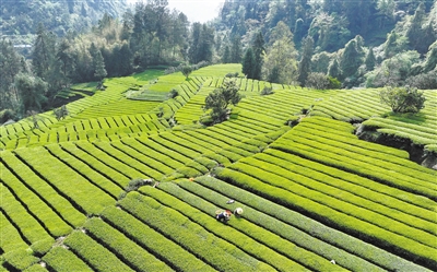 四月九日,湖北省宣恩县椒园镇中坝社区的茶农在采摘春茶(无人机照片)。