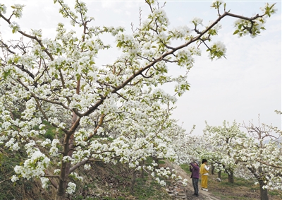 近日,河北省迁安市的梨树陆续开花,果农抢抓农时进行疏花授粉,构成一幅美丽的乡村画卷。 新华社记者 杨世尧摄