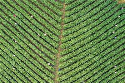 4月11日,采茶工在浙江省余姚市兰江街道茶园采摘茶叶(无人机照片)。