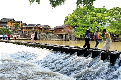 4月9日,游客在福建省漳州市南靖县梅林镇云水谣古镇参观游览。