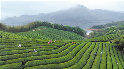 4月10日,茶农在浙江省湖州市德清县莫干山镇北湖村生态茶园采摘春茶(无人机照片)。
