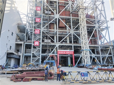 在1号锅炉前,工人师傅许良栋与王泽田正默契配合,细致固定散管、稳妥捆绑吊装钢索,一声指令后,塔吊稳稳将管道吊运至指定位置,每一个动作都严谨规范。不远处的风机房前,数十名工人手持扎钩,一丝不苟地捆绑钢筋,通力协作间,一根根钢筋纵横交错,不断向上延伸……