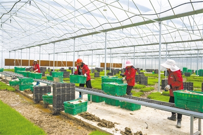四月十七日,在高塘岭街道湘江村智慧农场育秧大棚,工作人员把秧苗放在传输带上。