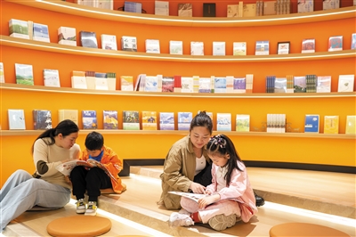 4月19日,在湖北省秭归县一家书店,家长陪同孩子阅读书籍。