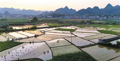 4月25日,农民在广西来宾市忻城县城关镇都乐村田间进行早稻插秧(无人机照片)。