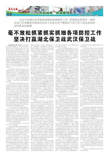 习近平代表党中央,向湖北和武汉广大党员、干部、群众致以诚挚的问候,向奋战在疫情防控第一线的广大医务工作者、人民解放军指战员、社区工作者、公安干警、基层干部、下沉干部、志愿者以及各个方面的同志们表示崇高的敬意,向正在同病魔作斗争的患者及其家属、因公殉职人员家属、病亡者家属表示诚挚的慰问,向在这场疫情中不幸罹难的同胞、牺牲的一线工作人员表示深切的哀悼。