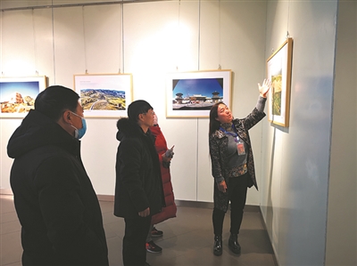 袁建琴为参观者介绍长城诗书画摄影创作展作品。 高燕 摄
