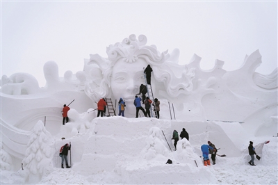 ▲12月10日,在太阳岛“雪博会”园区,雪雕师在进行雪雕制作。