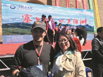 霍静(右)参加“塞上右玉 水色绿洲”活动时与外国画家合影