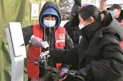 12月29日,在北京市顺义区旺泉街道宏城花园社区出入口,社区工作人员(左)为居民测量体温。