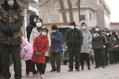 1月12日,石家庄市元氏县使庄村村民排队准备进行核酸采样。