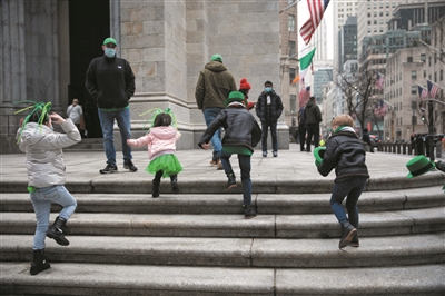 当天是爱尔兰文化传统的圣帕特里克节。受疫情影响,纽约没有像往年一样举行盛大的巡游活动。