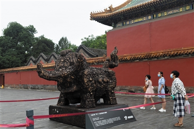 这是故宫内展出的《福牛辞“旧”》废弃物再生雕塑(7月13日摄)。