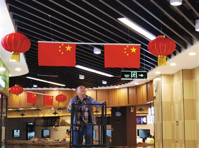 不管是熙熙攘攘的商场、超市,还是车水马龙的道路,还有充满烟火气的街巷,五星红旗或点缀在卖场通道、上空,或飘扬在道路两旁的灯杆上,或悬挂在沿街的商铺外……放眼望去,城市已成为一片红色海洋,到处洋溢着喜庆、欢乐、热烈的气氛。一面面鲜艳的五星红旗迎风飘扬,不仅让城市变得靓丽,更让市民感受到了浓浓的节日氛围。
